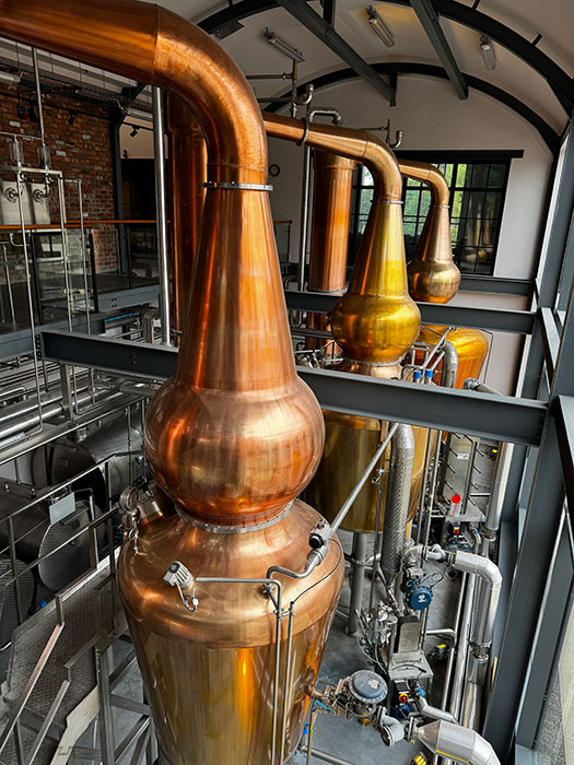 Destylarnia Hinch, wyposażona w trzy alembiki, większość alkoholu destyluje trzy razy, choć ma również możliwość podwójnej destylacji.